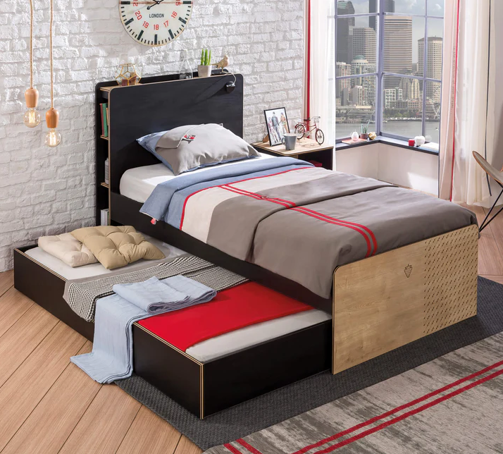 Παιδικό κρεβάτι της σειράς BLACK, το μοναδικό εφηβικό κρεβάτι που διαθέτει φόρτιση κινητού στο κεφαλάρι και θέσεις για μικροαντικείμενα πάνω στο κεφαλάρι.