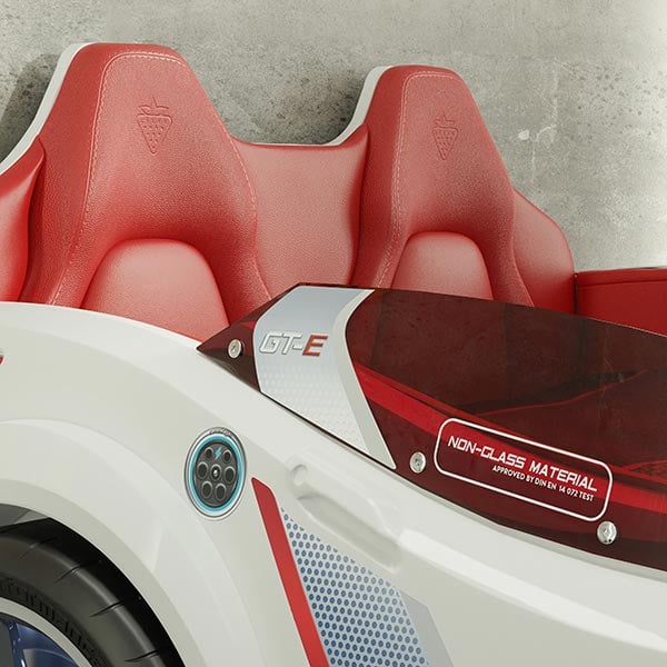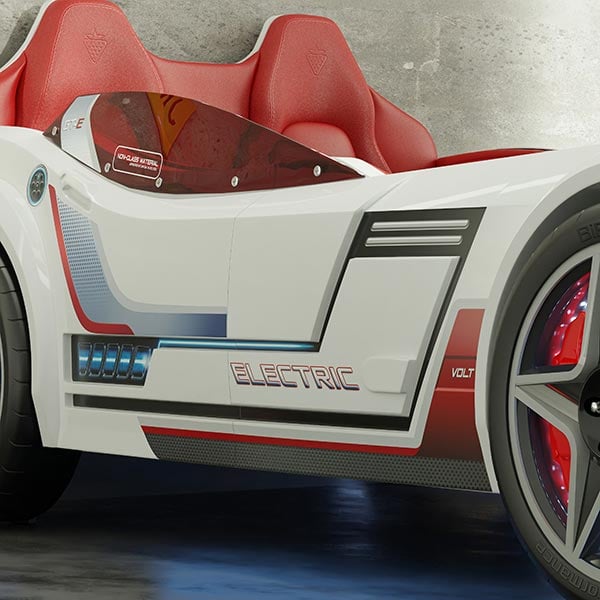 Ένα παιδικό κρεβάτι αυτοκίνητο που δεν έχει να ζηλέψει τίποτα, από ένα αληθινό, πλαστικά παράθυρα με εντυπωσιακά αυτοκόλλητα, μιμούμενο τα ηλεκτρικά αυτοκίνητα, διακοσμούν τα πλαϊνά του κρεβατιού και προστατεύουν το παιδί στον ύπνο του.