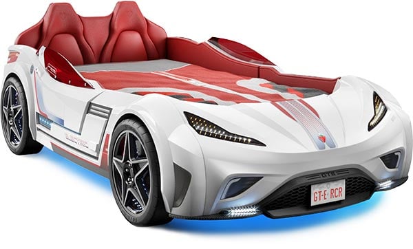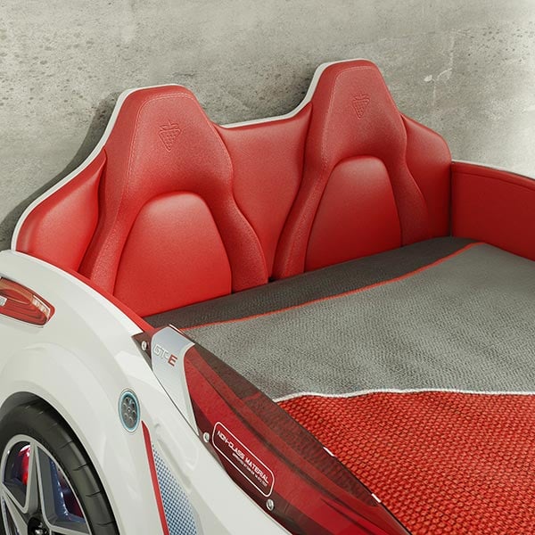Το νέο λευκό παιδικό κρεβάτι-αυτοκίνητο με κόκκινα καθίσματα για να τραβάει όλα τα βλέμματα των αγοριών.