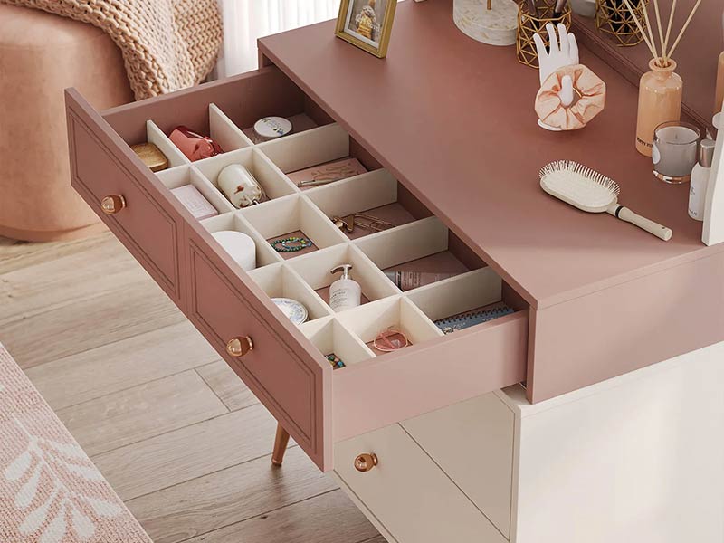 το πρώτο συρτάρι, της συρταριέρας σας προσφέρει μια μοναδική θήκη μπιζουτιέρας, για να τοποθετήσετε και να ταξινομήσετε σωστά τα προσωπικά σας είδη. Όλα θα είναι ταξινομημένα σωστά και πάντα έτοιμα για εσάς.