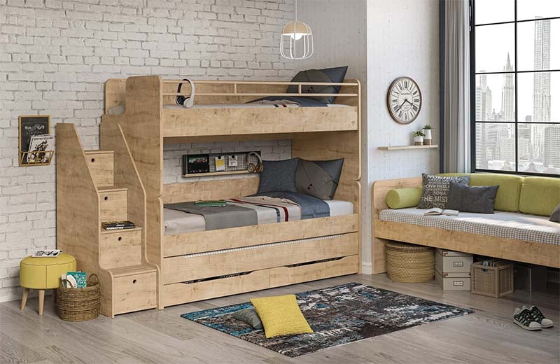 Με νέα πρόταση για την κουκέτα του δωματίου σας, με πολλές δυνατότητες, μπορείτε να την χωρίσετε σε 2 μονά κρεβάτια, η σκάλα με τα σκαλοπάτια, μπορεί να μπει από όποια πλευρά επιθυμείτε, αριστερά ή δεξιά, στο κάτω συρτάρι μπορεί να δημιουργηθεί και τρίτο κρεβάτι με την τοποθέτηση, ενός επιπλέον στρώματος, διαθέτει και συρτάρια για αποθηκευτικό χώρο.