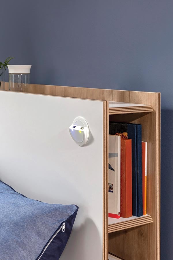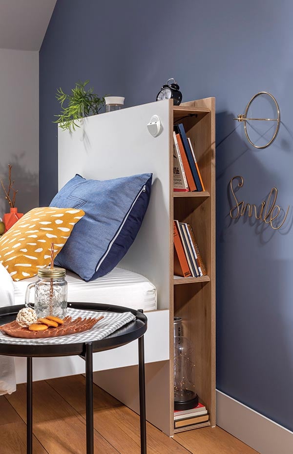 στο κεφαλάρι του κρεβατιού σας, υπάρχει ενσωματωμένη βιβλιοθήκη, έτσι ώστε να μπορείτε να έχετε πάντα δίπλα σας, τα αγαπημένα σας βιβλία, ή να την διακοσμήσετε με τα προσωπικά σας αντικείμενα, όπως εσείς θέλετε