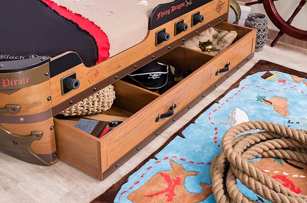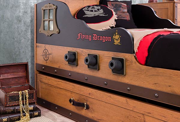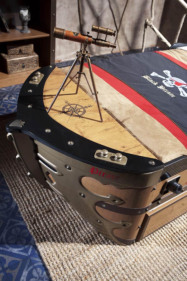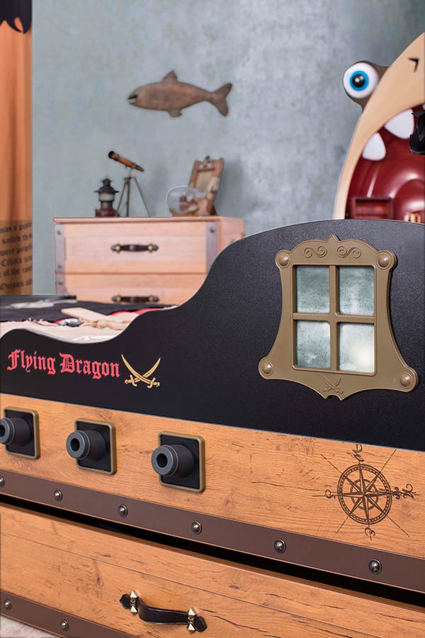 τα παράθυρα τον πειρατικών καραβιών μιμείται απόλυτα το κρεβάτι σας, οι πυξίδες, τα σπαθιά, αναδεικνύουν τον μοναδικό σχεδιασμό του και συμπληρώνουν όλη την εικόνα του κρεβατιού.