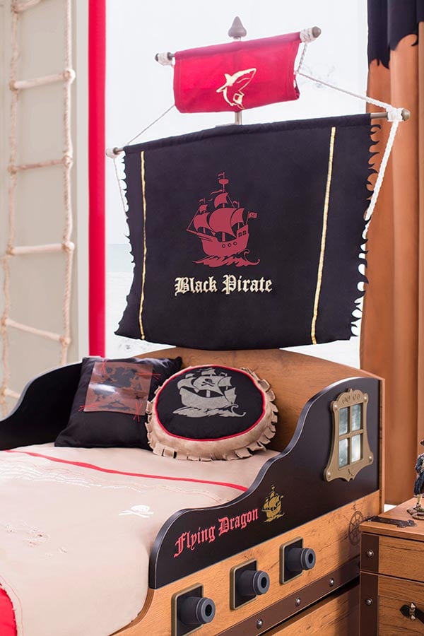 To παιδικό κρεβάτι-καράβι της σειράς BLACK PIRATE δεσπόζει από μόνο του σʼ ένα οποιοδήποτε δωμάτιο, δεν έχει τίποτα να ζηλέψει από τις πειρατικές γαλέρες των θρυλικών πειρατών. Πλέει στα όνειρα του κάθε παιδιού με ανοιχτά πανιά και κανόνια και είναι έτοιμο να κουρσέψει τα πέρατα των θαλασσών.