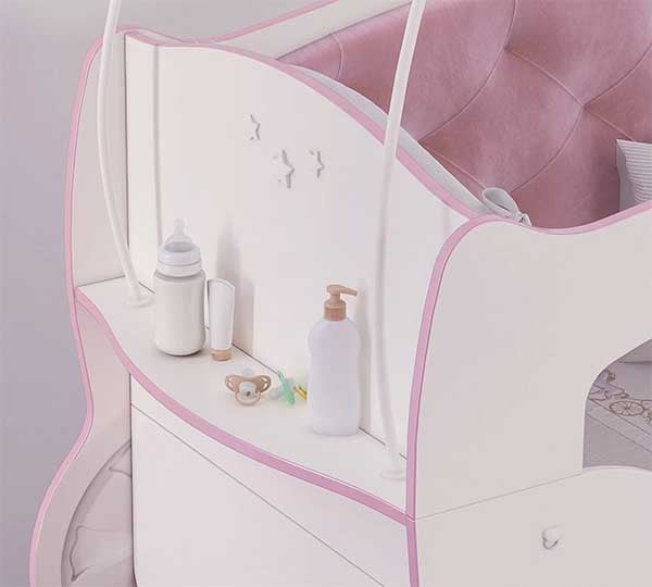 τα ραφάκια που βρίσκονται στην κάθε πλευρά της κούνιας, σας προσφέρουν την δυνατότητα να τοποθετήσετε αντικείμενα που θέλετε να έχετε πάντοτε κοντά σας, για την περιποίησή του μωρού σας.