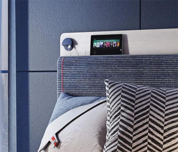 Ένα ιδιαίτερο  κρεβάτι με νεανικό ύφασμα στο κεφαλάρι, το κρεβάτι διαθέτει θύρα USB για φόρτιση κινητού ή tablet.