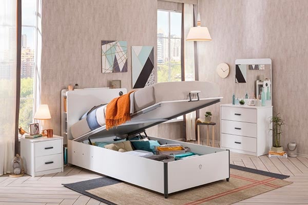 το κρεβάτι της σειράς White, σας προσφέρει έναν μεγάλο αποθηκευτικό χώρο, τόσο για τα προσωπικά σας αντικείμενα, όσο και για να τοποθετήσετε τα λευκά είδη που θα χρειαστείτε καθημερινά για το στρώσιμο του κρεβατιού, 2 υδραυλικές μπουκάλες σας διευκολύνουν κάθε φορά που θα χρειαστείτε να ανασηκώσετε το κρεβάτι.